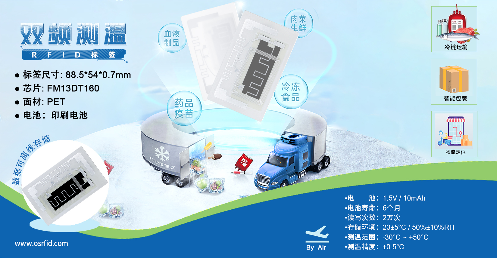,支持定時測溫數據存儲。标簽内裝有紙質電池,數據可離線存儲,全程監控溫度。